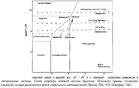 рН раствора, находящегося в равновесии с К-слюдой и адуляром, нельзя определить по фазовой диаграмме, подобной Рис. 1 с без знания концентрации К+ , поскольку Na и К являются главными катионами в эпитермальном растворе. Их отношение зависит от температуры, а концентрация хлора при данной температуре будет регулировать концентрацию К+ . Однако, для большинства разбавленных эпитермальных гидротерм концентрация К+ такая, что рН поля стабильности К-слюды-адуляра составит 5.6-5.8 при t=2500 С, что по - существу, является нейтральной реакцией при данной температуре. Таким образом, большинство глубинных эпитермальных гидротерм имеют почти нейтральный рН перед кипением и газовыделением, поскольку они являются стабильными для К-слюды—адуляра.