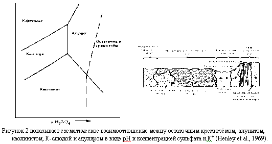 . Обобщённая иллюстрация взаимоотношений полей стабильности продуктов гидротермальных изменений дана в виде функции активностей K2 SO4 и H2 SO4 . Каолинит стабильнее пирофиллита при t ниже 2500 С. Кварц присутствует при постоянных t и Р; размер поля остаточного кремнезёма зависит от концентрации алюминия. Диаграмма и фазовые взаимоотншения составлены Henley et al.; Stoffregen.