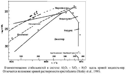 При насыщении кварцем, пирофиллит находится в равновесии с каолинитом при ~ 2500 С. Пирофиллит образуется при более высоких температурах. Этот парагенезис наблюдается, по-видимому, в равновесном состоянии в современных Филиппинских системах при более низких температурах, хотя минимальные температуры, как показывают эксперименты, при которых может существовать пирофиллит и диаспор - 2800 С.