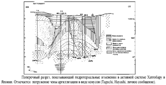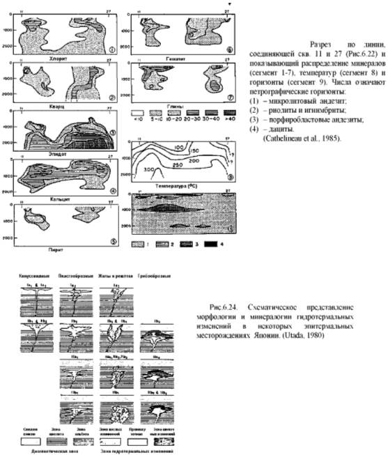Utada схематически обобщил зональность и морфологию зон эпитермальных изменений в гидротермальных системах и зон диагностических минералов в Японии.