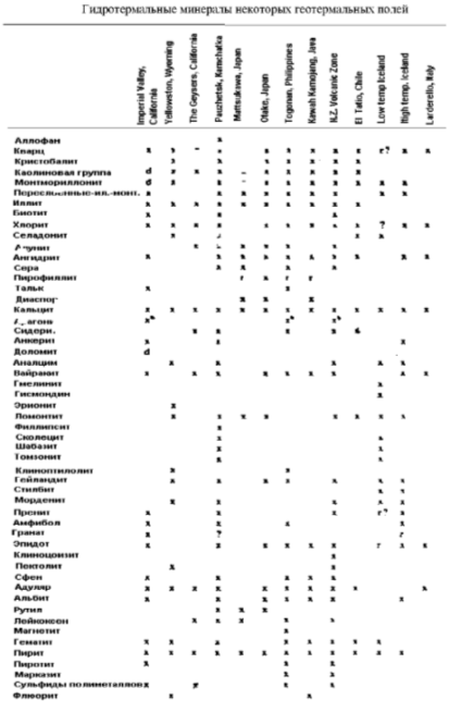 Исследователи, изучавшие гидротермальные изменения, неоднократно классифицировали наблюдаемые комплексы гидротермальных минералов в группы. Это было необходимо, т. к. в этом процессе образовывался очень разнообразный набор гидротермальных минералов. Таблица 1, а показывает минералы, образованные в активных геотермальных полях и эпитермальных рудных месторождениях.