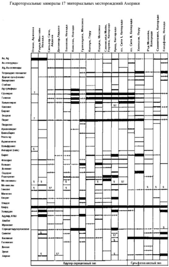 Минералы, представленные в 17 эпитермальных месторождениях, приведены в таблице 1,b. Они включают много редких, главным образом, рудных минералов.