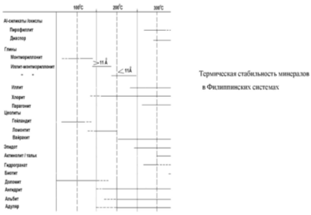 Мониторинг на геотермальных скважинах в последние годы позволил установить эмпирическую стабильность взаимоотношений минералов. Рисунки 7, 8 и .9 показывают различные оценки температур из различных работ. Отмечается значительное совпадение между наблюдёнными и предполагаемыми стабильностями, что позволяет считать таблицы надёжными и полезными в качестве эмпирических геотермометров.