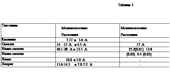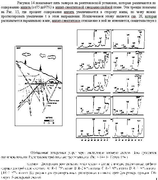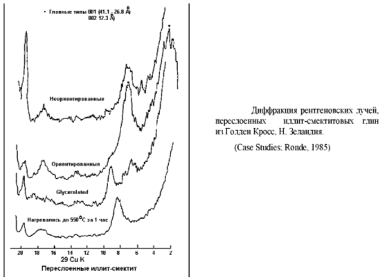 Это распределение температурной чувствительности глин было задокументировано при разведке Голден Кросс в Н.Зеландии. Таблица 3 включает его критерии для рентгеноструктурного определения различных глин и Рис.12 показывает основной пространственный режим слоистых глин после различных подготовительных методов.
