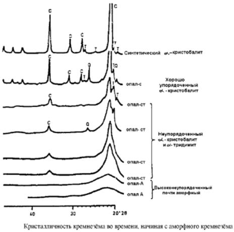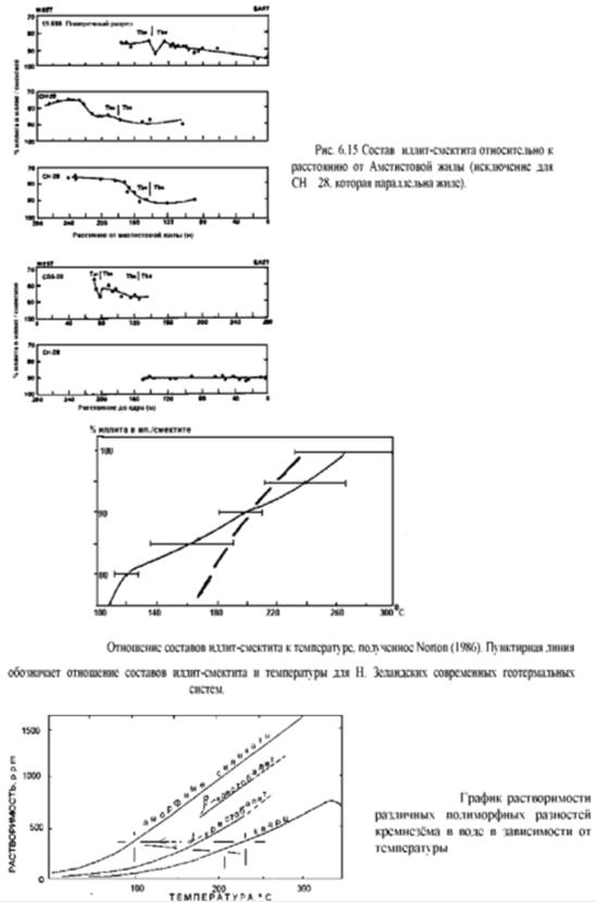 изменяются, поставляют кремнезём в гидротермы, до тех пор, пока достигается насыщенность по отношению к кварцу при данной температуре. Если гидротермы слегка остывают, то кремниевая кислота полимеризуется и осаждается в виде кварца при t от 3300 С до температуры ~2000 С. Ниже, от 180 до 2000 С наблюдается осаждение кремнезёма в виде кристобалита, а ещё ниже кремнезём осаждается в аморфном состоянии. Со временем при умеренной температуре аморфный кремнезём кристаллизуется в кристобалит, который затем перекристаллизовывается в кварц, хотя обычно размеры зёрен будут очень небольшие. Это увеличение кристалличности со временем иллюстрируется на рентгенограмме. Если же отмечается наличие кремнистых отложений на поверхности современных или палеосистемах, то можно прогнозировать минимальные субповерхностные температуры. Кремнистые отложения всегда осаждаются в аморфном состоянии. В кипящих источниках растворимость аморфного кремнезёма будет ограничивающим фактором содержания кремнезёма в гидротермальном растворе. Следовательно, если глубинные гидротермы находятся в равновесии с кварцем при 2350 С и их охлаждение в результате подъёма к поверхности происходит до 1000 С, то равновесие насыщения будет соответствовать аморфному кремнезёму; если глубинная температура несколько выше, то кремнистые отложения будут образовываться на поверхности. Если гидротермы поднимаются адиабатически от ~2100 С, то пароотделение будет повышать концентрацию кремнезёма в остаточной жидкой фазе гидротерм таким образом, что насыщенность аморфного кремнезёма достигается при 1000 С.