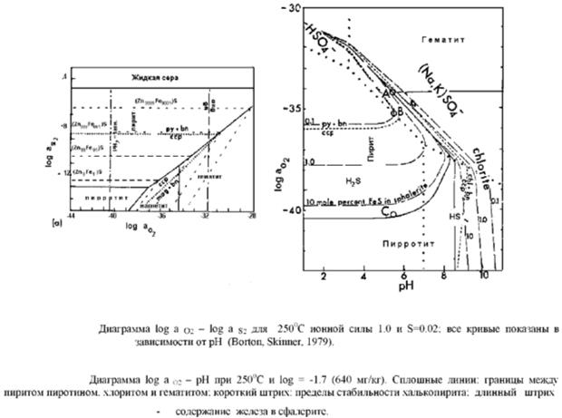 а S2 - а О2 и а О2 - рН и показывают относительные стабильности сульфидов и окислов в эпитермальных условиях. Рисунок 19,а может иметь границу сульфид/сульфат для данной концентрации серы и рН 4 для эпитермальных условий он стремится располагаться ближе к границе магнетит/гематит. Использование различных минеральных комплексов и химических составов минералов приводит к получению состава рудных гидротерм, в результате чего можно что-то сказать о химических условиях рудообразования и в связи с этим в дальнейших дискуссиях о комплексных соединениях, которые переносят золото и другие металлы.