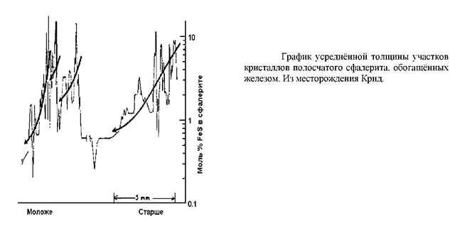 Сфалерит является индикатором. Если сфалерит находится в равновесии с пиритом и хлоритом, повышенная а О2 будут отражены в пониженном содержании FeS в сфалерите. Это легко определяется зондовым анализом и иногда даже прямым наблюдением, т.к. сфалерит с низким содержанием Fe изменяется от медновожёлтого цвета до темного красно-коричневого, когда обогащён Fe. Зональный сфалерит из из коллекции Криде имеет изменяющееся содержание FeS, как показано на Рис. 20. Эта зональность позволяет предполагать периодическую "пульсацию" восстановленных гидротерм. Флюидные включения, проанализированные из каждой зоны роста, также отражают "подачу" различных гидротерм с различной температурой и минерализацией для каждой зоны. Такие исследования даже поверхностные, при мелкомасштабной разведке, могут идентифицировать среду, благоприятную для золотого рудоотложения.