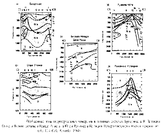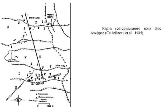 Это горизонтальное расположение гидротерм по отношению к их вертикальному положению прекрасно иллюстрируется в геотермальной системе Лос Азуфрес. На хорошо разбуренном участке установлены термальные границы системы и Cathelineau et al., определили, что они великолепно соответствуют распределению гидротермальных минералов, зависящих от температуры.