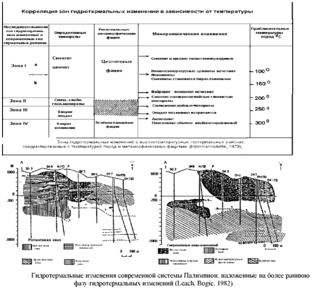 Для интерпретации различия этих двух альтернативных событий часто привлекаются детальные исследования распределения зон гидротермальных изменений, а также данные по геохронологии возможных источников тепла. Типичные примеры таких взаимоотношений в Палимпионском геотермальном поле показаны на Рис. 2 Leach, Bogie отмечают, что современные гидротермальные изменения налагаются на боле ранний тип изменений в современной системе Негрое.