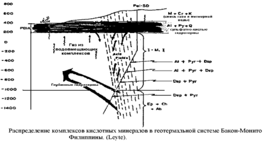 Алунит, каолинит, пирофиллит и самородная сера встречены на глубинах 400-600м. Скважины же вскрыли типичные разбавленные хлоридные гидротермы с нейтральными рН на глубине 800 м при t=280°C Здесь сульфатно-кислые гидротермы, образованные на поверхности района андезитового вулканизма с высоким рельефом, инфильтруются в систему вдоль разломов. Это приводит к образованию воронкообразного ореола гидротермальных изменений. Этот ореол изменённых пород распространился латерально по наиболее проницаемым горизонтам. Зоны распределились от кислого изменённого ядра с переходом в зону регионального метаморфизма пропилитового типа, поскольку кислые гидротермы нейтрализовались в результате взаимодействия вода-порода.