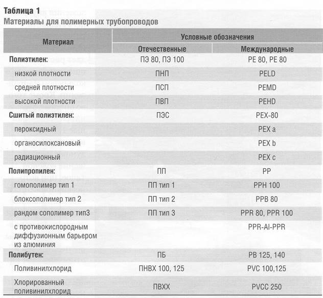 При производстве пластмассовых труб используются эффективные коррозионно-стойкие материалы, в частности различные полимеры, выпускаемые промышленностью высокоразвитых стран. К ним относятся: полиэтилен, акрилонитрилбутадиенстирол, полипропилен, полибутилен, телефталат, эпоксидные винилэфирные смолы и т. д. (табл. 1) [1].