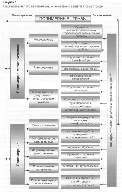 Область применения полимерных труб приведена в классификации (рис. 1). Конечно, это далеко не полный перечень возможностей применения труб, изготавливаемых из полимеров или с их добавками, но и по приведенной классификации видно, что в настоящее время накопился уже достаточно большой опыт как в зарубежной, так и в отечественной практике использования прогрессивных коррозионностойких материалов для изготовления труб, так необходимых для нефтегазовой отрасли.