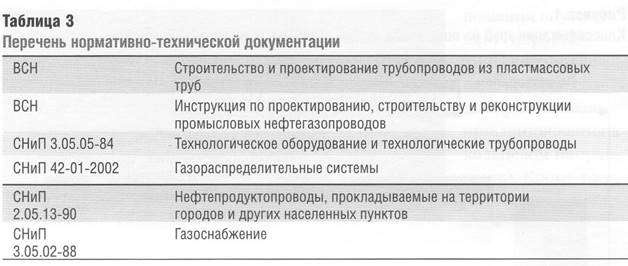 Существенным тормозом в расширении внедрения полиэтиленовых труб и соединительных изделий является отсутствие нормативно-технической документации по проектированию, строительству и эксплуатации полиэтиленовых нефтегазопроводов. Действующая документация не в полном объеме сориентирована на применение полиэтиленовых технологий. Как видно из таблицы 3, «возраст» СНиПов составляет от 5 до 23 лет. Они не учитывают изменения характера строительства трубопроводных систем, появления новых материалов и оборудования, новых прогрессивных технологий их строительства и эксплуатации.