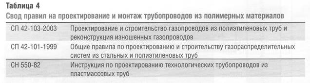 В развитие устаревших СНиПов разработаны своды правил и инструкции для проектирования и сооружения трубопроводов из полиэтилена (табл. 4). Ведомственные строительные нормы распространяются на проектирование и строительство новых и реконструируемых внутри- и межплощадочных трубопроводов нефтяных и газовых промыслов и трубопроводов - ответвлений к отдельным потребителям, сооружаемых из пластмассовых труб.