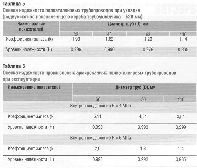 С целью обоснования внедрения новых технологий сооружения и восстановления изношенных участков трубопроводов сотрудниками ТюмГНГУ проведены исследования по оценке надежности полиэтиленовых трубопроводов при их сооружении и эксплуатации (табл. 5, 6) [4, 5].