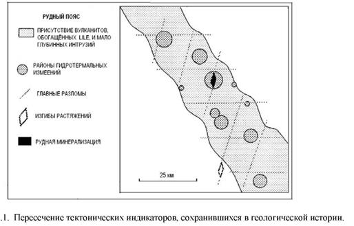 Чтобы найти старые рудные пояса или распространение известных древних поясов и месторождений в них, требуется палеотектоническая реконструкция. Для этого используются эквиваленты современных тектонических индикаторов, которые сохранились в геологической истории. Они приводятся в таблице 1. Порядок, который для них принят в виде примеров, представлен от регионального до локального масштаба. Эти масштабы сужены от поясов, сложенных вулканическими и субвулканическими породами, образовавшимися из метасоматизированной мантии, до районов гидротермальных изменений внутри них, и которые в свою очередь имеют внутри разломы, часть из которых связана со структурами растяжения. Рудники располагаются вблизи или в рудоносных интрузиях, которые ассоциируются со структурами растяжения, или они связны с разрабатываемой рудной минерализацией, которая непосредственно образовалась в пределах структуры растяжения.
