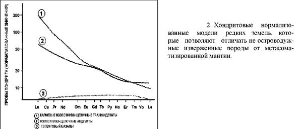 Большие литофильные элементы, из которых калий (ионный радиус 133рм) наиболее обычен, являются самыми привлекательными, но из литофильных трековые элементы относительно немобильны во время гидротермальных изменений. Присутствие повышенных концентраций литофильных элементов в вулканических породах указывает, что они произошли из метасоматизированной мантии. Эта ассоциация изверженных пород, обогащённых литофильными элементами, и золотых месторождений не является случайным совпадением. Когда золото находится в виде хлор-комплекса, то оно имеет очень похожие химические свойства с литофильными элементами (ионный радиус 137рм). Особенность калиевых известково-щелочных пород, сильно обогащенных литофильными элементами, может быть использована для их идентификации, при условии, что гидротермальные изменения не разрушили вмещающие их минералы. Обогащение литофильными элементами также сопровождается обогащением лёгкими редкими землями, которые можно быстро определить по отношению лёгких редких земель к тяжелым REE (рис.2).