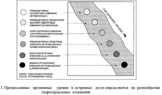 Если пояс известково-щелочных или калиевых известково-щелочных пород был идентифицирован, то районы гидротермальных изменений в этих поясах указывают на нахождение здесь гидротермальных систем. Как обсуждалось ранее, имеется много районов рудной минерализации и немного рудников. Еще больше имеется районов гидротермальных изменений сравнительно с районами рудной минерализации. Уровни эрозии могут изменяться постепенно вдоль поясов и их изучение даже там, где они могут не иметь рудной минерализации, они могут быть определены (рис. 3).