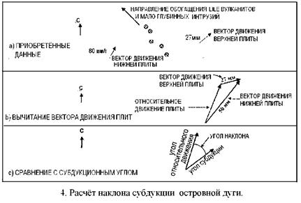 Островные дуги параллельны зонам субдукции, которые их формирует. Зона столкновения, где происходит образование магмы из метасоматизированного мантийного клина, формирует более рассеянные островные дуги, но здесь тоже имеет место субпараллелизм. Угол, перпендикулярный к простиранию зоны субдукции, принимается в качестве угла субдукции и сравнивается с углом относительного движения плиты (рис. 4). Если два угла одинаковы, то субдукция будет перпендикулярной и структуры растяжения, секущие пояс, будут представлены нормальными разломами с таким же простиранием. Только они имеют очень ограниченное расширение и, мало вероятно, что вмещают большие рудные месторождения.