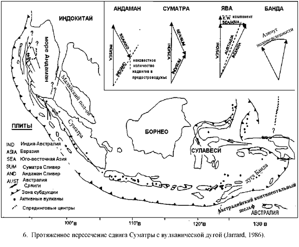 Там, где угол скоса (рис. 4с) большой, наклон зоны субдукции также будет большим. Сдвиговые разломы будут протягиваться параллельно островной дуге и могут перекрывать или простираться рядом с дугой, если имеется высокая степень сцепления между верхней и нижней плитами. К сожалению, только угол скоса может определяться для старых островных дуг. По нему можно лишь прийти к выводу о том, что имеется ли высокая вероятность параллельного наложения сдвиговых разломов, там, где угол скоса превышает 45°, но это не всегда присутствует в случае современных островных дуг. Это наиболее особый случай, когда происходило формирование больших депрессий тыловых дуг. Ситуация, где островная дуга и сдвиг накладываются или простираются параллельно дуге, наблюдается на Суматре, центральных Филиппинах, Колумбии и на юге Чили. Очевидно это очень благоприятная ситуация, поскольку пересечение разломов, которые могут иметь расширяющиеся выступы, и островные дуги максимально похожи (на примере Суматры; рис. 6).