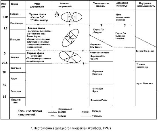 Плио-плейстоценовая группа Лас Сьеррас представляет рудоносную дугу в Западном Никарагуа. Эпитермальные золотые жилы размещены в подстилающих более древних образованиях группы Эл Койол и распространены, преимущественно, на севере и северо-западе (Malone, Stoiber, 1987). Они имеют рудную минерализацию, сформировавшуюся во время перехода от второй к третьей стадии деформаций (рис. 7). Эллипс напряжений для второй стадии деформаций показывает северо-западное простирание нормальных разломов. Они параллельны линиям напряжений, вмещают рудную минерализацию, тогда как во время третьей фазы деформации нормальные разломы простирались в меридиональном направлении. Этот переходный период совпадает с концом магматической активности группы Лас Сьеррас. Идентификация рудных дуг и структур в районах гидротермальной активности, одновременных с островной дугой, следовательно, может непосредственно указывать на локализацию рудной минерализации.