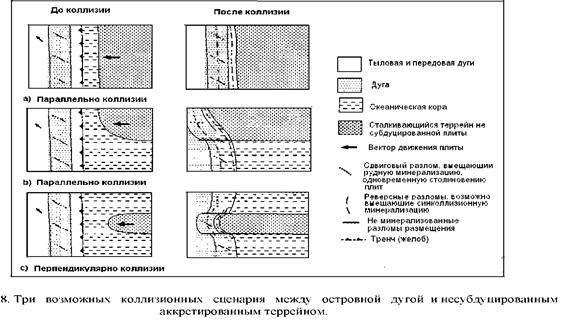 Там, где коллизия происходит перпендикулярно дуге маломощному террейну (рис. 8с), дуга будет изгибаться вокруг обеих сторон террейна и, возможно, компенсируется на любой стороне террейна вдоль соответствующих разломов. Это приводит к образованию новых после рудных структур и ранее минерализованные разломы будут иметь различную ориентацию, по отношению к той, в которой они образовались.