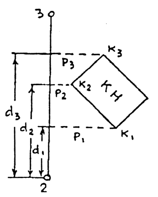 Способ перпендикуляров используют для съемки точек, расположенных на открытой местности вблизи сторон теодолитного хода . Для определения положения углов здания к1 , к2 , к3 достаточно опустить на линию 23 теодолитного хода перпендикуляры и измерить расстояния d1 , d2 , d3 от твердой точки 2 по линии теодолитного хода до оснований перпендикуляров и длины перпендикуляров p1 , р2 , р3 (рис. 6).