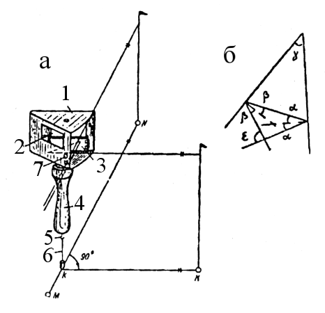 различных конструкций наибольшее распространение получил двухзеркальный экер. Внутри металлического корпуса 1 с прямоугольным окошками 2, под которыми на внутренних сторонах укреплены зеркала 3 под углом γ = 45° относительно друг друга. Через окошко наблюдатель смотрит не веху, установленную на точку N. Перемещая экер по линии MN, находят так положение, когда отраженное от двух зеркал изображение вехи над точкой К будет совпадать с направлением на веху в точке N, что будет соответствовать положению экера в вершине прямого угла NkK, эту вершину через середину ручки 4, крючок 5 проектируют отвесом 6 на ленту (земную поверхность).