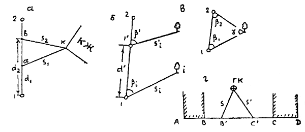 Рис. 8. Схемы съемки контуров способами: а — линейной засечки; б — полярным; в — угловой засечки; г — створов