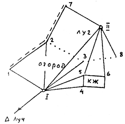 При теодолитной съемке заполняется абрис — схематический чертеж, на котором изображают вершины и створы теодолитного хода, снятую с них ситуацию, записывают результаты угловых и линейных измерений (рис. 9). Абрис составляют непосредственно во время съемки. При составлении абриса на нескольких листах должно быть перекрытие изображения, т. е. последующий лист должен начинаться с точек, которыми закончился предыдущий. Абрис является исходным документом для составления плана теодолитной съемки, поэтому его нужно составлять четко, аккуратно, чтобы при его использовании не было разночтений и неопределенностей.