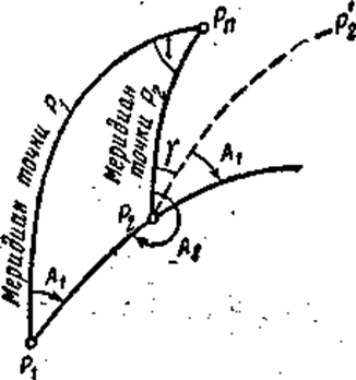 Прямой азимут направления P1 P2 (см. рис.1.) будет A1 , а обратный для того же направления - А2 . Меридианы не параллельны между собой, поэтому азимут линии в каждой ее точке имеет разное значение. Угол между направлениями двух меридианов в данных двух точках называется сближением меридианов и обозначается через γ Как видно из рис 1, зависимость между прямым и обратным азимутами линии выражается формулой