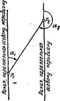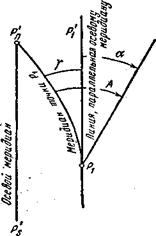 где γ— сближение меридианов в точке Р1 , т. е. угол между изображениями осевого меридиана и меридиана данной точки. При пользовании формулой надо иметь в виду, что сближение меридианов точек, расположенных к востоку от осевого меридиана, имеет знак плюс, а к западу — знак минус. Прямой и обратный дирекционные углы одной и той же линии отличаются на 180° и определяются: