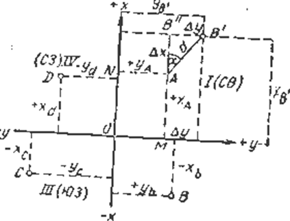 В зависимости от направления стороны АВ' приращения координат Δх и Δ у могут иметь знак плюс или знак минус. Знаки приращений координат определяют по направлениям сторон, т. е по их дирекционным углам.