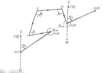 Для контроля вычисления дирекционных углов следует найти конечный дирекционный угол а n по дирекционному углу а III-ПЗ 19 последней стороны и исправленному углу bПЗ 19 при вершине ПЗ 19