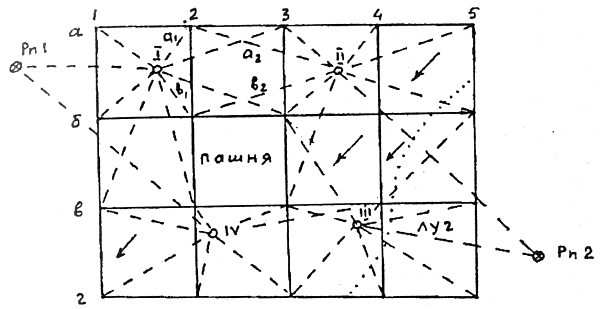 Рис. 1. Абрис нивелирования поверхности по квадратам (стрелками показано направление скатов).