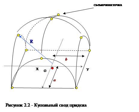 Купольный свод придела является частью поверхности сферы, вырезанной четырьмя вертикальными плоскостями (1,2,3; 3,4,5; 5,6,7; 7,8,1) в зонах примыкания свода купола с арками (рисунок 2.2).