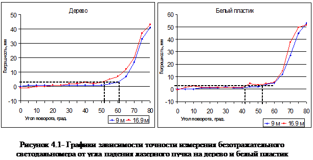 Полученные в ходе исследований данные по каждому расстоянию и виду отражающей поверхности сведены в таблицы, по ним построены графики зависимости точности измерения безотражательного светодальномера от угла падения лазерного пучка. На графиках рисунка 4.1 в качестве отражающих поверхностей – дерево и белый пластик.