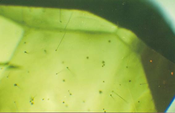 Двухфазные газово-жидкие включения с преобладанием газовой фазы достаточно редко встречаются в хризобериллах. Отдельные кристаллы содержат светлоокрашенные трубчатые включения, расположенные параллельно друг другу.