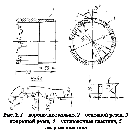 Забойный снаряд для бурения второй ступени скважины состоит из твердосплавной буровой коронки СМ6 (коронка применяется для бурения пород средней твердости, относящимся к IV-VII категориям по буримости, рис. 1 ) диаметром 76 мм, кернорвателя, калибровочного расширителя, одинарной колонковой трубы диаметром 73 мм, переходника с колонковой трубы на бурильные трубы П1.