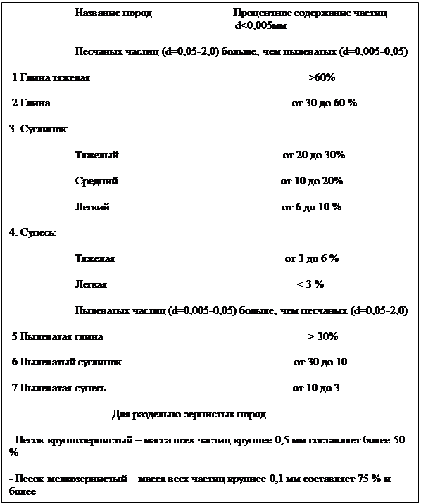 Породы делятся по размерам частиц: валуны (камни) – более 200мм, галька (щебень) – 10-20мм; гравий (дресва) – 2-10мм; пески – 0,05-2мм; пыль – 0,005-0,05мм; глины - <0,005мм.