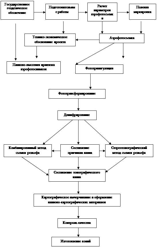 Перед производством аэрофототопографических работ разрабатывается технологическая схема, определяющая очередность и взаимосвязь различных видов работ. Особенностью технологической схемы является выбор масштаба, высоты сечения рельефа, физико-географические условия, сроки изготовления, обеспеченность инструментами и приборами, конечная стоимость изготавливаемой продукции. В дальнейшем технологическая схема используется в процессе разработки проектов выполнения отдельных видов работ, при финансировании работ и графиков выполнения работ. Технологическая схема разрабатывается на основе исходных данных, приведенных в таблице 1.