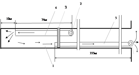 1- штрек, 2-нагнетательный вентилятор; 2- вентиляционная труба; 3- перемычка; 4- свежая струя воздуха; 5- отработанная струя воздуха,