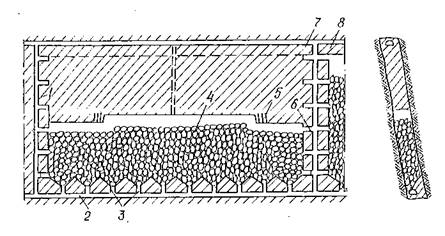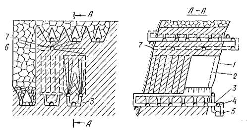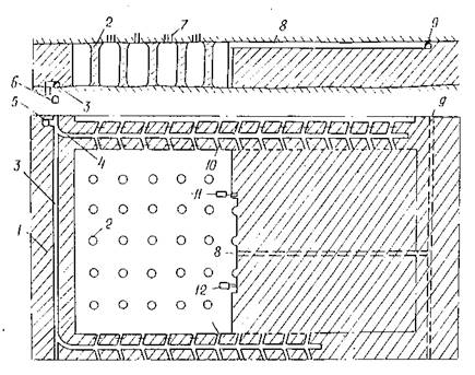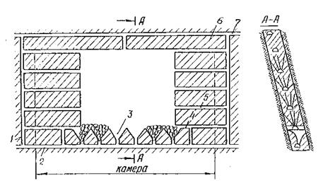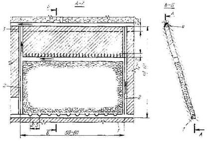 Для подготовки блока проходят откаточный штрек 1 и восстающие 2. Первый слой извлекают одновременно с проведением откаточного штрека или после его проведения. В первом случае проводят штрек высотой от 3 до 5 м, а затем на высоте 2 м устанавливают распорки с укладкой на них прочного настила. В настиле через 3-5 м устраивают люки. Восстающие имеют два отделения, закрепленные распорной или срубовой крепью.