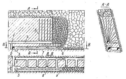 1 — ходок; 2 — орт; 3 — рудоспуск; 4 — буровой штрек; 5 — скважины для отбойки руды; 6 — предохранительный козырек; 7 — вентиляционный штрек; 8 — виброконвейер; 9 — вибропитатель