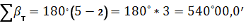 Вычисления начинают с вычисления исправленных горизонтальных углов (графа 3). Поскольку измеренные горизонтальные углы (графа 2) содержат неизбежные случайные погрешности, практическая сумма Σβпр не равна теоретической Σβт . Причем несовпадение этих сумм дает угловую невязку fβ .