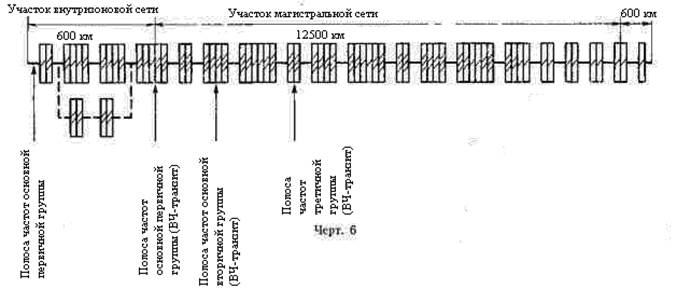 · Максимальная протяженность номинальной цепи первичного сетевого тракта страны составляет 13700км (черт. 6). Максимальное число транзитов первичного сетевого тракта этой цепи должно быть не более 19 (20 простых первичных трактов), из них: