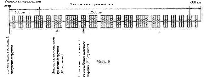 · Максимальная протяженность номинальной цепи вторичного сетевого тракта страны составляет 13700 км (черт. 9). Максимальное число транзитов по вторичному тракту этой цепи должно быть не более 19 (20 простых вторичных трактов), из них: