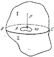 Рассмотрим основное понятие гидростатики — гидростатическое давление. На рис. 2.1 представлен некоторый произвольный объем покоящейся жидкости. Разделим этот объем плоскостью ВС на две части — I и II. В плоскости ВС выделим площадь ω с центром в точке А. Давление со стороны части I объема будет передаваться на поверхность ВС с силой Р .