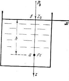 Интегрируя данное уравнение, можно его использовать для различных случаев покоя жидкости. Рассмотрим частный случай, когда жидкость находится в покое под действием силы тяжести. На рис. 2.3 на поверхности жидкости наметим точку в , в которой давление Р0 . Начало координат совместим с точкой в , а ось z направим вниз. Выделим точку а , в которой жидкость находится под действием силы тяжести, равной весу р= mg . Примем массу m =1, тогда p = g , т. е. единичная массовая сила будет равна ускорению. Проекции этой силы на ось x и y будут равны 0: X =0; Y =0. Проекция силы тяжести на ось z = g , т. к. направление оси совпадает с направлением силы тяжести вниз, к центру Земли.