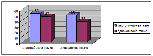 В диссертационной работе рассматриваются специфические особенности терминополя «нефть и газ» в английском и казахском языках, которые составляют один сегмент, включающий терминологические единицы с одинаковыми или сходными структурно-семантическими характеристиками. По внутренней структуре термины делятся на однокомпонентные и многокомпонентные, например: англ. – sedimentation ─ седиментация, orifice ─ отверстие; каз.- кенорны ─ field, жоба ─ draft (однокомпонентные); англ.– abrasiveness of rocks ─ абразивность пород, capacity drum ─ емкость ; каз.– кәделеуіш қазандық ─ котел утилизатор, өнеркәсіптік кенорны ─ месторождение промышленное (многокомпонентные). На примере диаграммы в терминосистемах нефтегазовой отрасли сопоставляемых языков наблюдается тенденция к преобладанию многокомпонентных терминов над однокомпонентными.